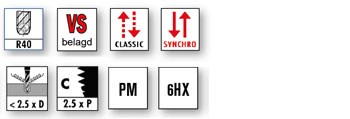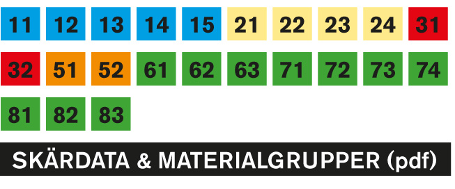 | Bearbejdningsmateriale | P - Stål, M - Rustfri stål, K - Støbejern, N - Ikke jernholdige material, S - Superlegeringer |