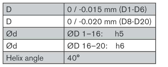 Fås fra Ø1 – Ø20 mm. Standard frislibning på 3xD.