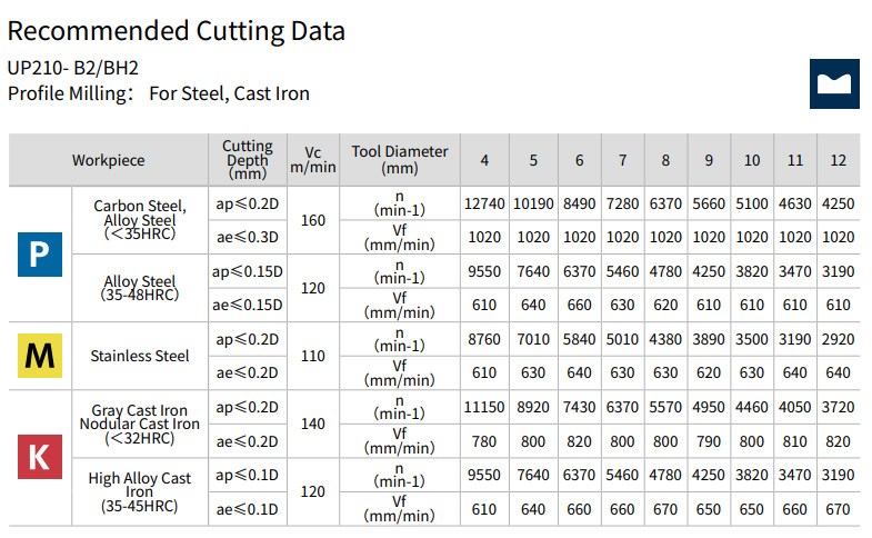 | Bearbejdningsmateriale | P - Stål, M - Rustfri stål, K - Støbejern |