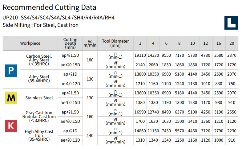 | Bearbejdningsmateriale | P - Stål, M - Rustfri stål, K - Støbejern |